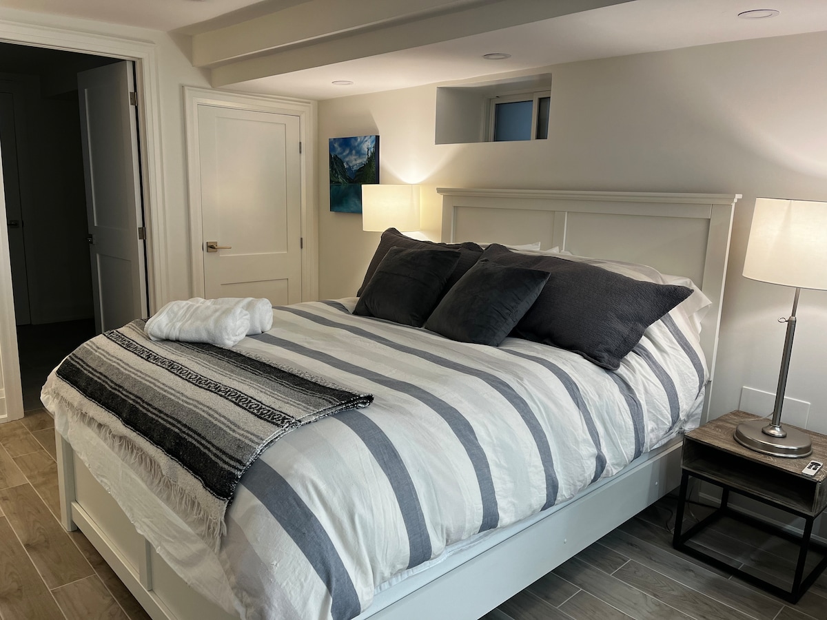 We have an ideal place for you regardless of work, pleasure, or family time. The recently renovated suite includes: - Separate keyless entry - 2 bedrooms with closets - Living room with 55" TV - Full kitchen with storage & dining - 2 full bathrooms (1 en suite) - 2 on-premises Parking - Laundry - WiFi & more FAST EV Charger-Check for availability ($15/charge) CENTRAL LOCATION! Steps to Upper Canada Mall, Groceries, Restaurants, Trails, Parks, Golf Course, Costco, Walmart, Highway, Go, & more