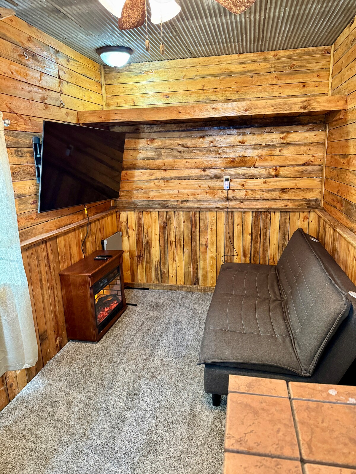 Cozy DRY Cabin Retreat with horse pasture views! Sleeps 3 with two fold-out couches (2 doubles), 50” smart TV, mini fridge, microwave, and a private fire pit. Enjoy a semi-private outdoor shower (swimwear recommended) and clean outhouse nearby. No running water, but drinking water provided. Firewood bundles available for purchase. Peaceful, rustic, and perfect for unwinding under the stars.