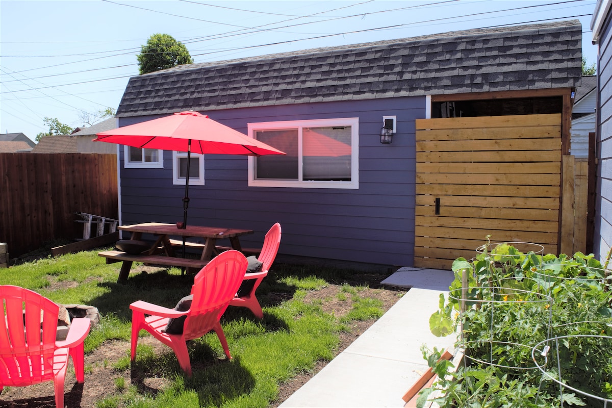 This Tiny (340 Square ft including loft) Garden House is the perfect retreat and tiny living experience for anyone visiting Tacoma or the surrounding area! Equipped with all of the essentials - a queen-size bed (loft), full-size pull out sofa, smart TV, Fireplace, A/C, refrigerator, gourmet coffee maker, 2 induction cooktops, spa shower with 9 different shower heads, fast Wifi, private entrance with a charming patio, and more! The Garden House is sure to please any traveler passing through.