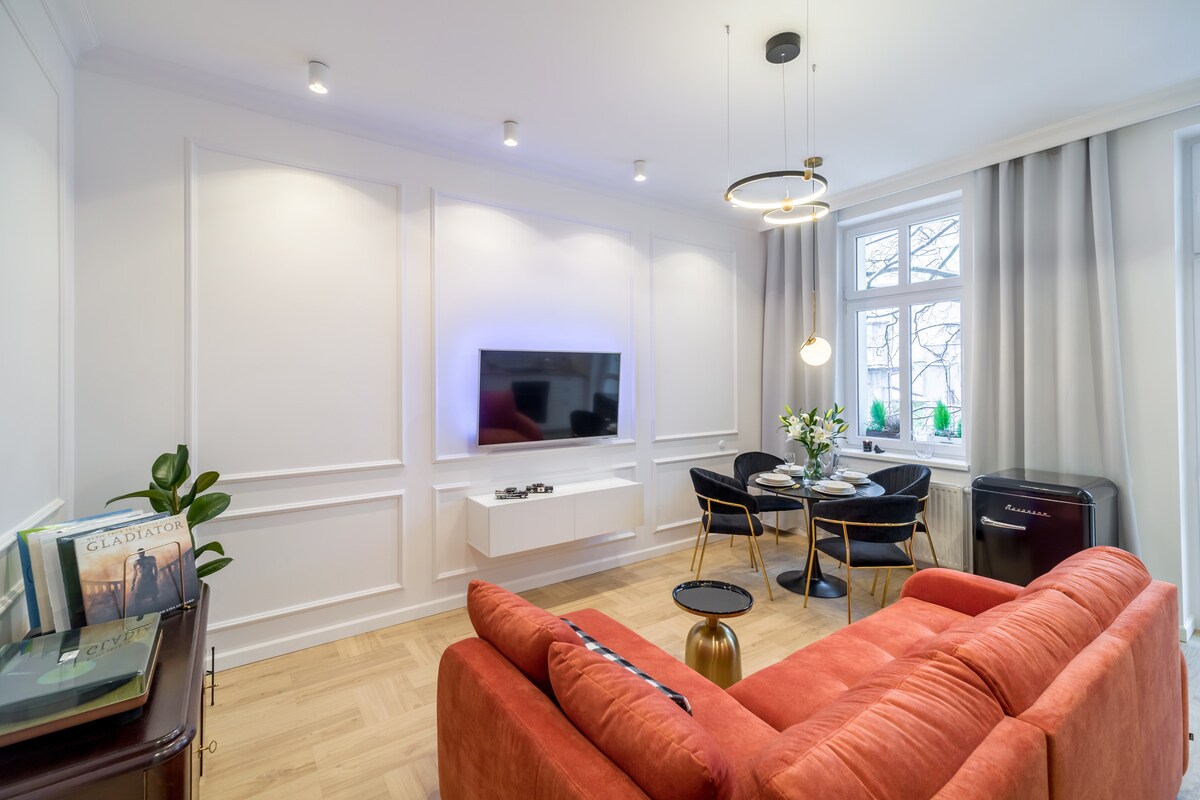 💎 🇫🇷 Feel the Parisian vibe! 🥂 Enjoy the Fireplace 🌡️, Turntable 💿, Premium Marshall Audio 🎼, and FAST WiFi (Comfort and Independence Guaranteed). This is your exclusive, two-room Art Déco retreat, perfect for a luxurious long weekend or business trip. Elegant AC Apartment in the city center, in a historic tenement house dating back to 1906. Discover the best of Bydgoszcz – the Market Square, Theater, and charming paths along the Brda River are just around the corner.
