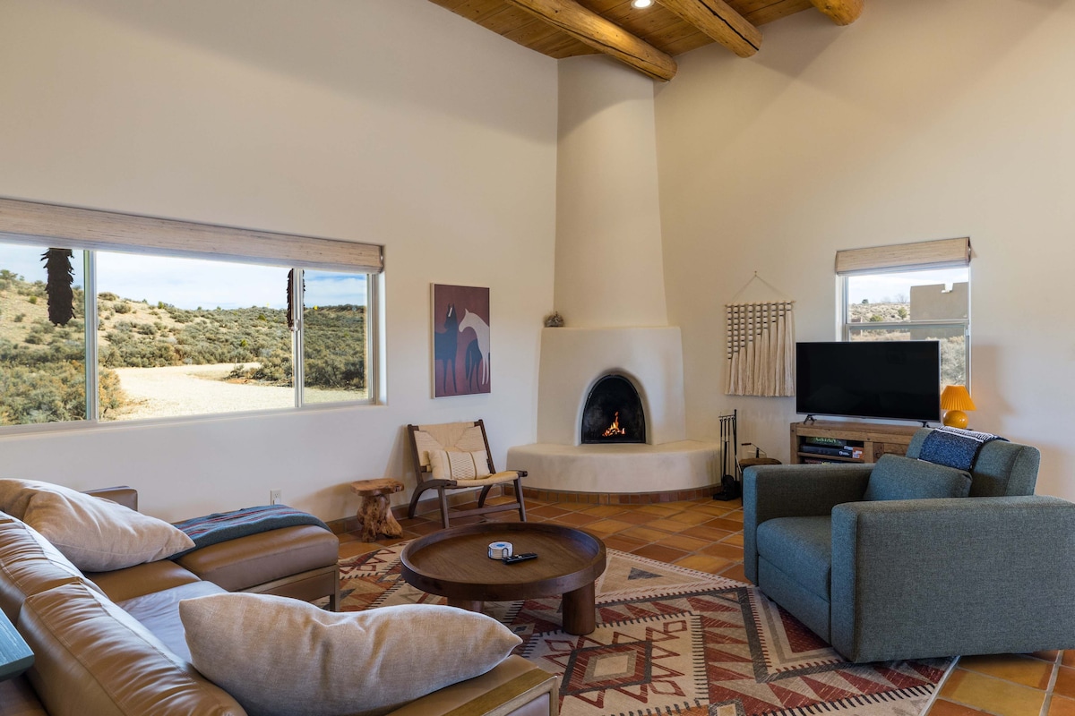 Relax at this peaceful newly constructed modern retreat that's close to town. Perfect for small families or two couples. Enjoy the nearly 360 views, epic sunsets, outdoor dining, and a brand new hot tub. Only 4 miles from Taos. You get the best of both worlds: that feeling of being away from it all while still only being minutes from amazing dining and art. We are also than 30 miles from Taos Ski Valley and Angel Fire Resort. Make your memories at Casa del Sol.