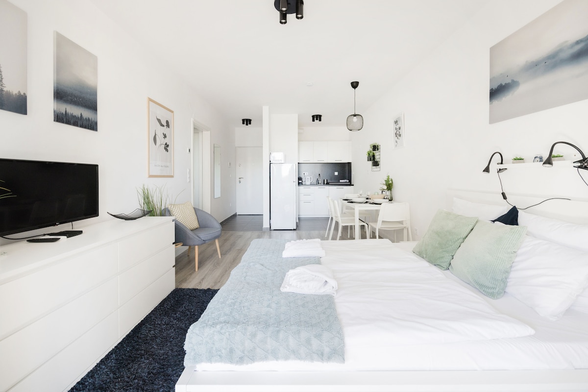 This stylish, authentic, modern, sunny, full-equipped studio was renovated and furnished to a high standard. The studio is on the highest (4th) floor in the building (with elevator), so even though located in the very center of Palace District, it is still very quiet. The internet is high speed, so it is perfect to use as a home office. The apt is located 3 mins walking distance from Blaha Lujza square (metro 2, 4/6 tram - 24/0), buses, bars, restaurants, cafes are also super close :)