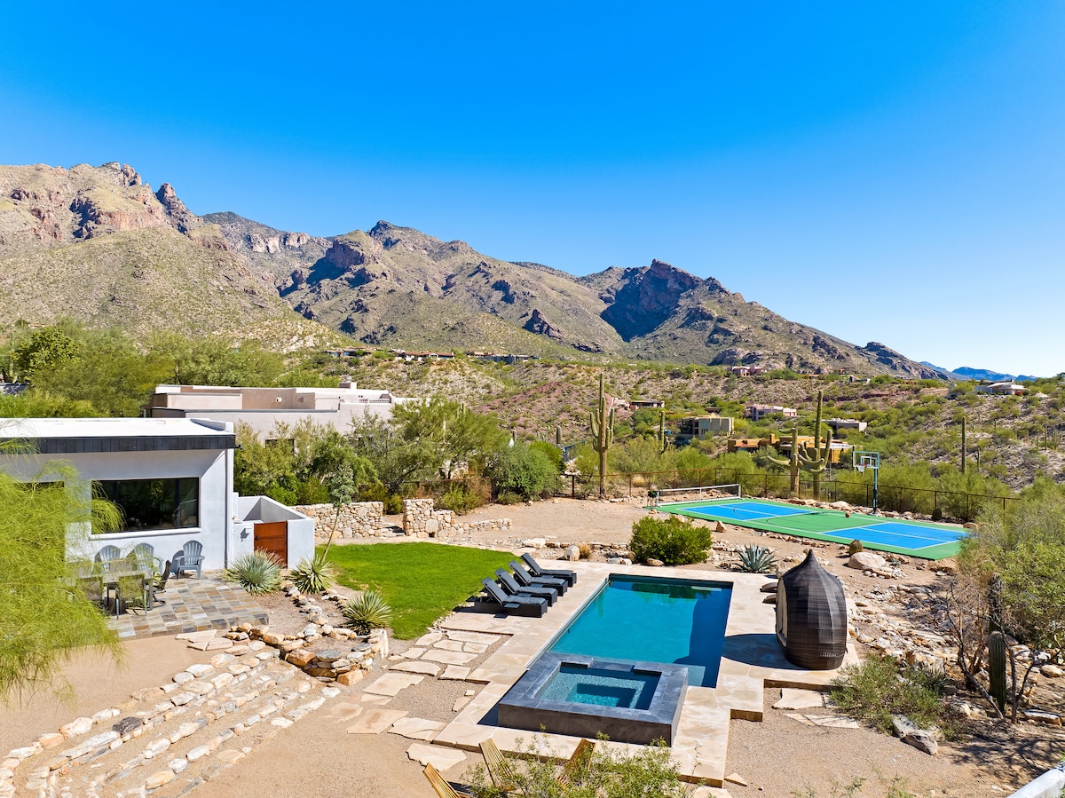 Rejuvenate in the only home in the neighborhood what provides undisrupted views to Cathalina mountains and the entire city of Tucson! This home offers sustainable living, with a fully indoor/outdoor connection, swimming pool, hot tub and amazing privacy! The light, airy home features open-plan living and over sized windows to maximize the breathtaking views. Enjoy drinks on the patio and a sunset. In the evening, light a fire in the outdoor fireplace and relax in a lounge chair under the stars.