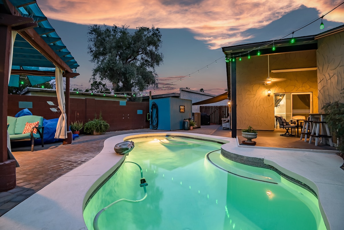 Enjoy easy access to all valley attractions from this centrally located, hideaway retreat nestled near the base of South Mountain. Malls, Scottsdale nightlife, hiking, golf, ASU, MLB, NFL, NBA, NASCAR, water parks, zoo, airport - all within minutes. But, why leave here? Covered Patio with Big Screen projector TV, dining, a pool (HEATED if you choose), or simply use the Hot Tub and hang around the fire table. Maybe put on your chef's hat and BBQ if that's how you feel. Welcome!
