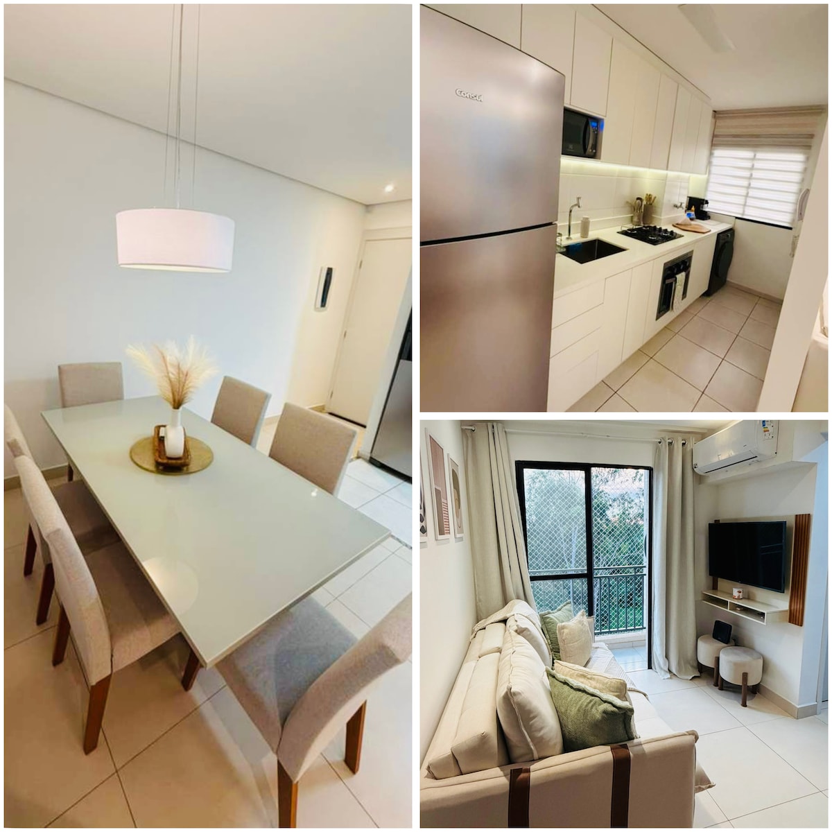 Apartamento aconchegante, utensílios para cozinha completo, incluso roupas de camas, toalhas, máquina de lavar e secar, uma suíte em um dos quartos. Tudo novo e uma ótima localização, tudo perto, supermercado, farmácia, shopping etc. O condomínio conta com uma área de lazer completa com piscina, sala de jogos, campo, quadra, academia e playground e que podem ser utilizadas pelos hóspedes. OBS: Para utilizar a piscina precisa apresentar no condomínio Atestado Médico válido.