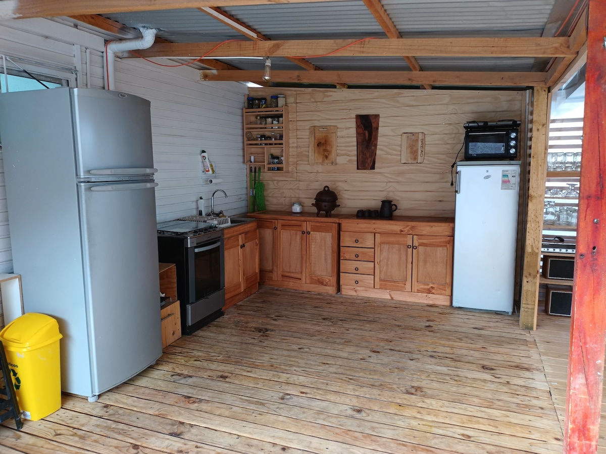 Rustic-modern private cabin located 2 blocks from Plaza de Pisco Elqui, close to restaurants and businesses. Private parking. 1 bedroom with private bathroom, 1 double bed (sheets, blankets, quilt, pillows and cushions). 1 nightstand, 1 lamp, 2 bedside rugs, sofa, restored antique furniture and 1 Bluetooth speaker. 1 electric heater for winter. Kitchen, dishwasher and minibar on the terrace (pots, dishes, cutlery, kettle, etc.) and charcoal grill. There is a lot of vegetation around.
