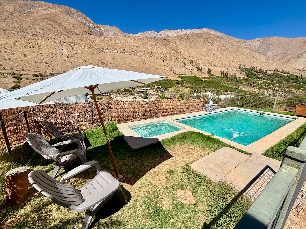 Rustic house, has a swimming pool for exclusive use and is located in a rural area 1.5 km from Vicuña (5 to 7 minutes by car). It has 2 bedrooms, one of which has a slanted window to look at the night sky. It also has a wooden hot tub, special to enjoy a bath in hot water and contemplate the starry nights of the Elqui Valley (the use of the hot tub has an additional value of $40,000 and must be booked the day before). There's a cell phone signal.