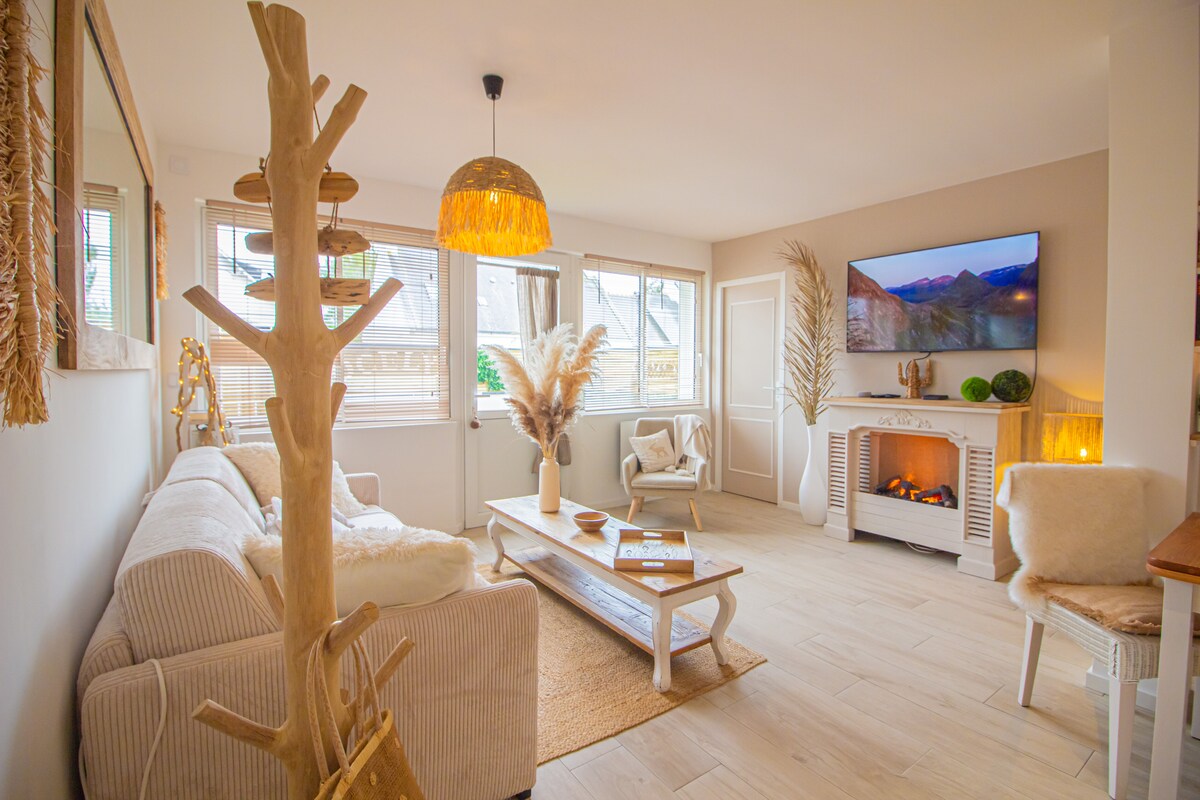 Océlya is a cozy nest completely renovated, ideal for a stay for two or with a baby. Sofa bed, connected TV, fireplace, equipped kitchen, spa shower, washing machine. Cozy room with comfortable bedding. Sheets, towels and essentials provided. Private garden of 24 m² facing south, enclosed, without neighbors, with barbecue and sun loungers. Pets welcome. Quiet, comfort and charm less than 500 m from the sea and many activities: horse riding, tennis, paddle, casino, mini-golf.
