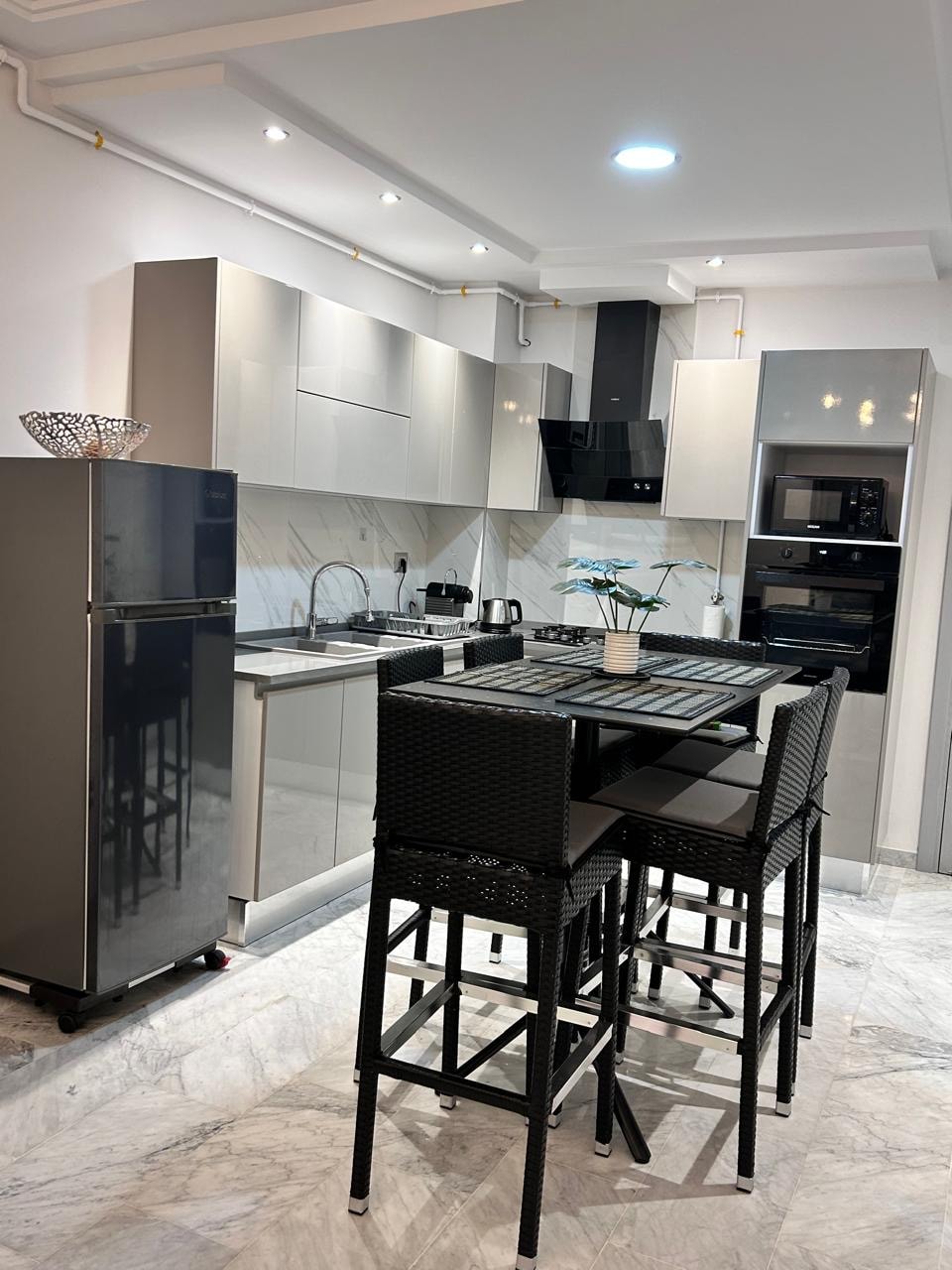 A high standing S+1 apartment, located in Mrezga Hammamet, in a strategic and tourist area. This is a ground floor apartment, fully equipped and luxuriously furnished, including a private garden, a master bedroom with garden view, a living room also open to the garden, a fully equipped modern kitchen, as well as a toilet and a shower cubicle. A private parking space is also available. The beach is only a 7-minute walk away.