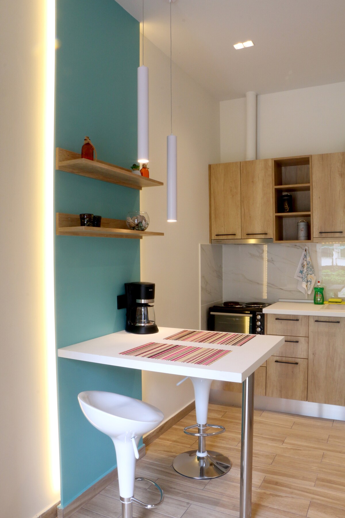 This beachfront apartment features a spacious balcony with beautiful views of Thermaikos Bay and Thessaloniki. It includes a large, cozy living room with a sofa that converts into a double bed, as well as a kitchen with an additional sofa. The small yet comfortable bathroom has a shower and a tap for everyday needs. The kitchen is equipped with a mini oven and complimentary laundry facilities. Additionally, there is unlimited 300 mbps Wi-Fi. The apartment has been fully renovated.