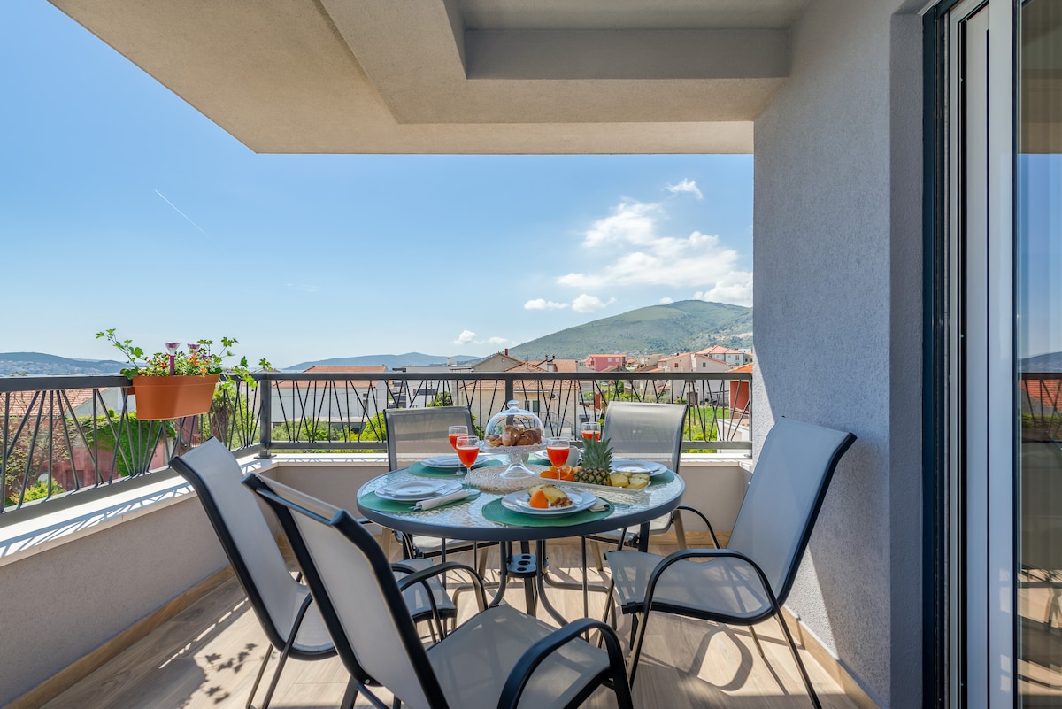 Opustite se u ovom ugodnom i lijepo uređenom smještaju. Apartman Adriano vam nudi opustanje u jakuzziju uz panoramski pogled na cjeli zaljev od Splita do Trogira. Velika terasa gdje se mozete druzit uz veceru koju ce te pripremit na velikom plinskom rostilju i uzivat u jelu pod zvjezdama i pogledom na ocean. Apartman je nov i luksuzno opremljen cjeli prostor je samo za vas plus terasa i jakuzzi. Sta je najvaznije imat ce te potpunu intimu i mir. plaze , restorani , ducani su 15min hoda.