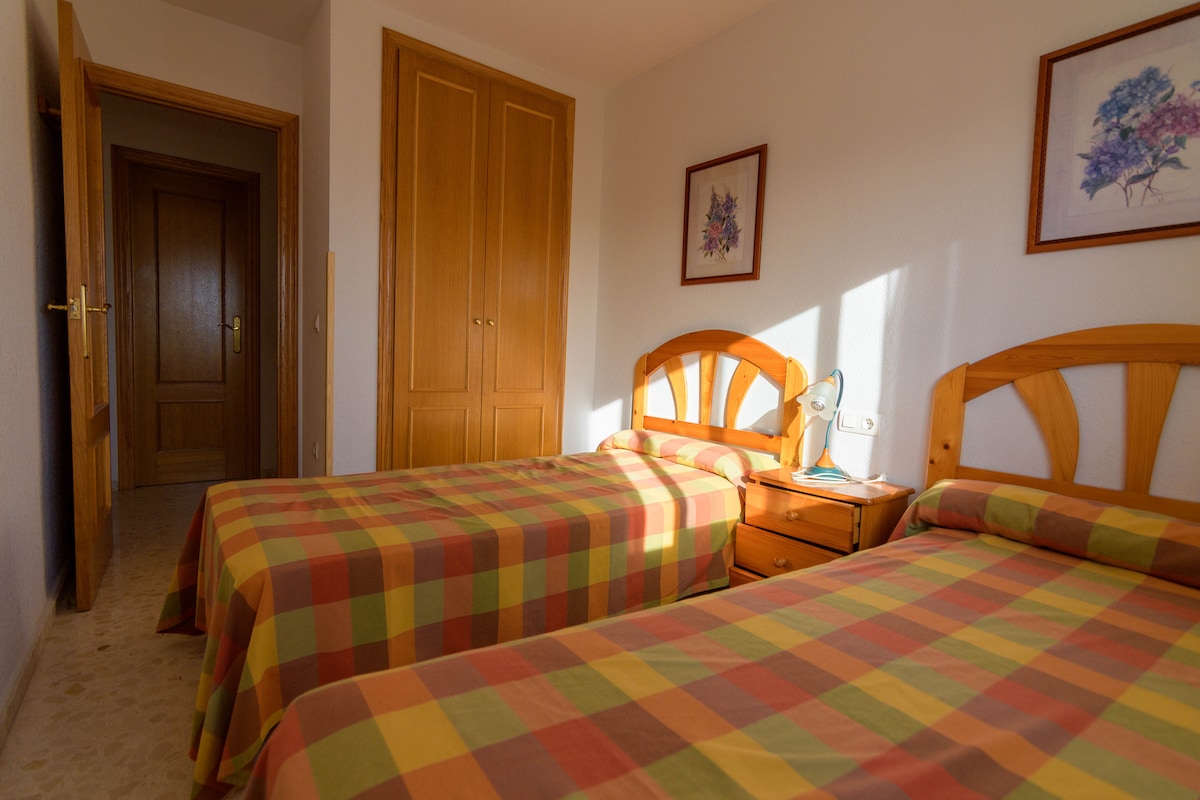 Es una 4 planta con ascensor. Apartamento de dos habitaciones una de ellas con aire acondicionado potente que puede refrescar las dos habitaciones. En el salón hay un aire acondicionado portátil. Además hay ventiladores en todas las estancias.. Dispones de 4 sillas bajitas reclinables y 1 sombrillas para la playa. El apartamento está equipado con tostadora, plancha,batidora, sandwichera, cafetera dolcegusto, ...Secador, jabón, champú, azucar, aceite, vinagre...