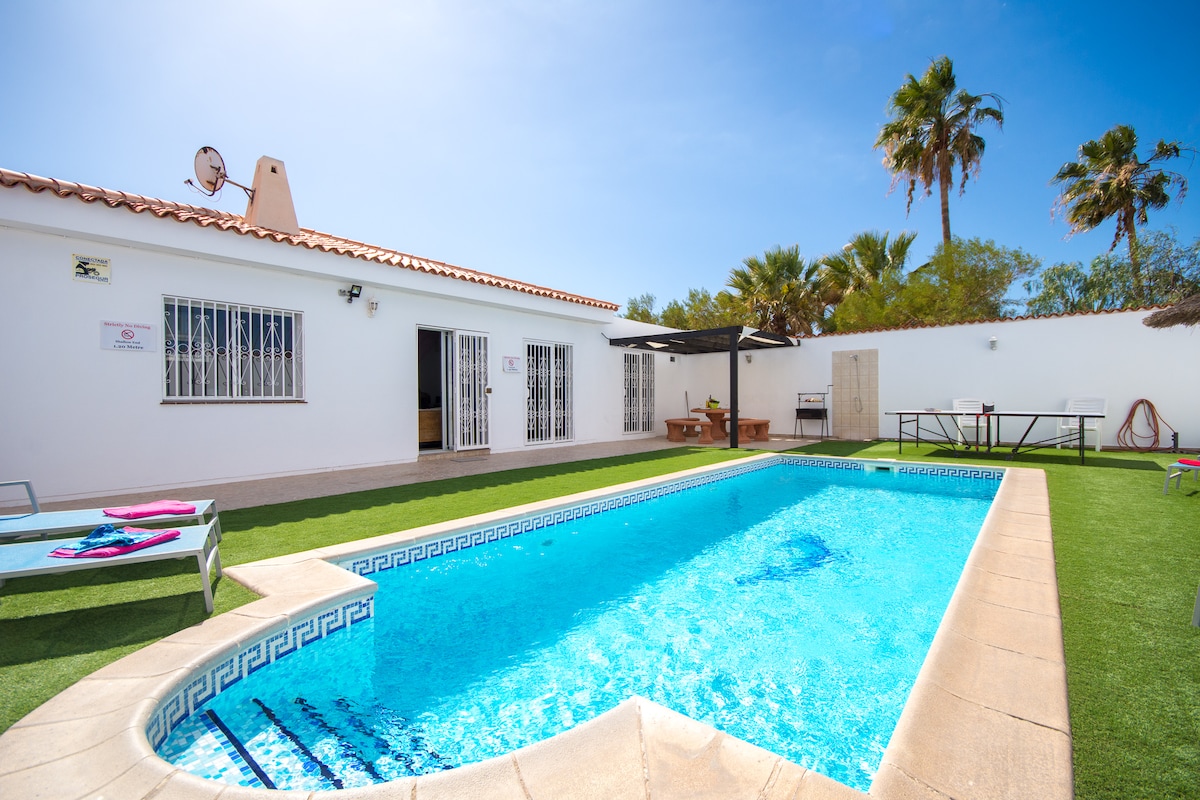 Independent house in one of the wonderful coastal towns of Tenerife just a 30 second walk to the beach. Equipped with solarium, chillout area, barbecue, artificial grass, solar shower, WIFI, kitchen, kitchen, cooking utensils, washing machine, flat screen TV with moving tv... The area has 2 natural pools, beach, supermarket and bars. Just a 15 minute drive from the beach from the Americas, siampark and Reina Sofia Airport. PARTIES ARE NOT ALLOWED