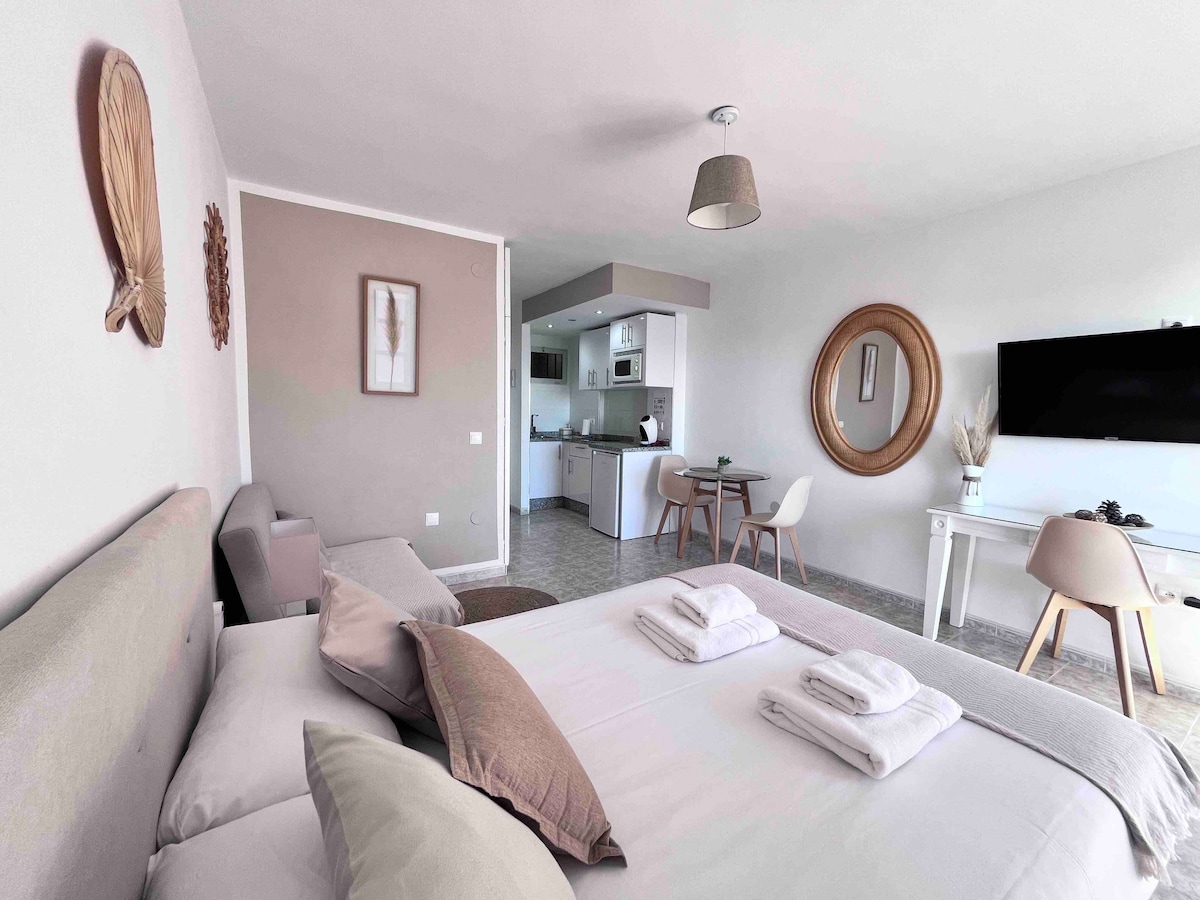 Wake up to Mediterranean light and pleasant sea views in this stylish studio suite. Bright and well designed, the open-plan space features a comfortable double bed, equipped small kitchen, and modern bathroom. Renovated in recent years and carefully maintained for a relaxed stay. The terrace is ideal for breakfast in the sun. Walking distance to the beach, restaurants, cafés, and daily essentials. Notice: Elevator replacement works from January 2026. No works in July and August.