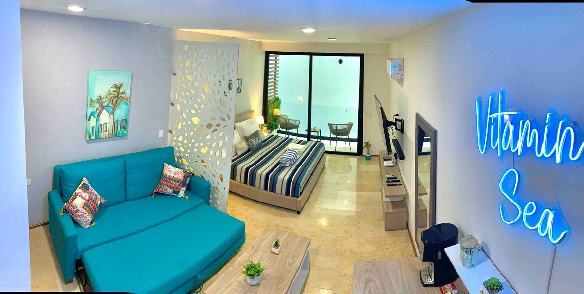 Enjoy a stylish experience at this centrally-located place. Just a few steps from the most privileged area of 5th Avenue in Playa del Carmen and one block from the beach, surrounded by the best restaurants and near the emblematic Calle Corazón. New luxury SMART studio for three people, automated to control air, curtains, light, and more.