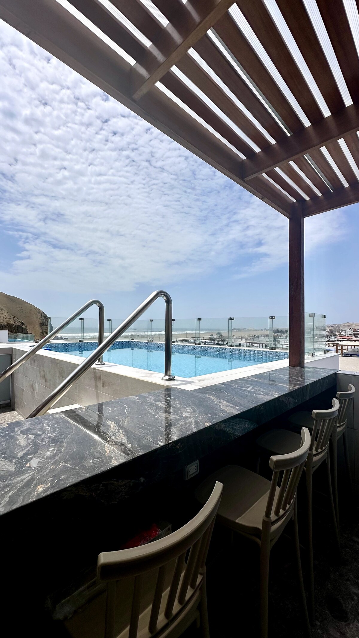 Disfruta de una estancia tranquila y familiar frente al mar. Nuestro departamento de 180 m² para 10 personas ofrece vista panorámica al mar desde todos los ambientes, terraza con poltronas, piscina y parrilla. Ideal para relajarte con familia, amigos y tu mascota =). Para la playa: Incluye toldo en la playa, sombrilla, sillas y paletas. Km 124.6 Playa Los Delfines, entre Playa Honda y Lobos; a 25 min del Boulevard de Asia y 10 min de Cerro Azul.