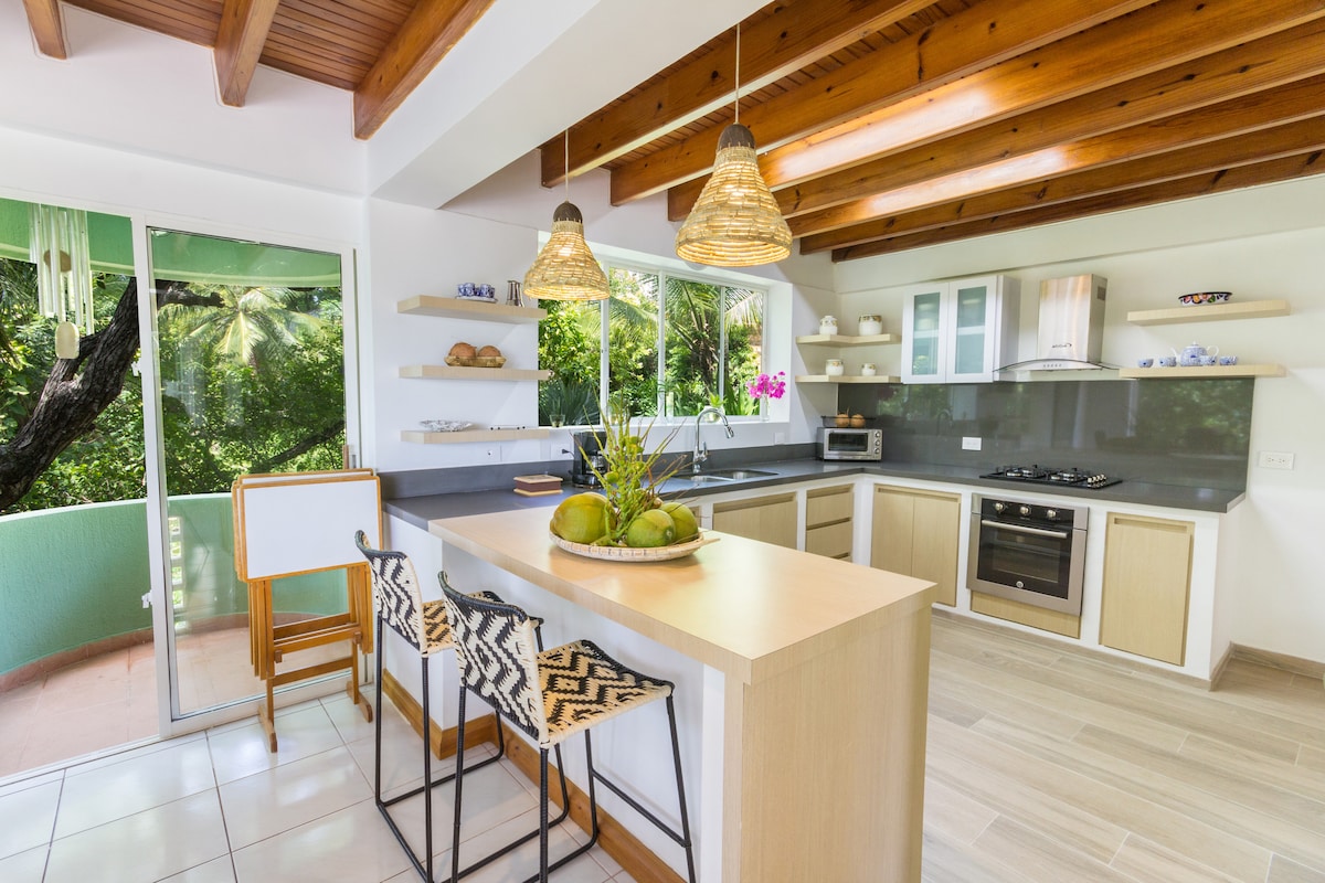 It is a place located in the central/upper part of the island, where the privileged topography favors a spectacular panoramic view of the ocean and the surrounding vegetation made up of tropical species, ancient trees and fruit trees. These views can be enjoyed from the bedrooms, terraces, social areas and even from the kitchen. It has a private pool area where the sound of the trees in the breeze makes it an unparalleled place of rest.