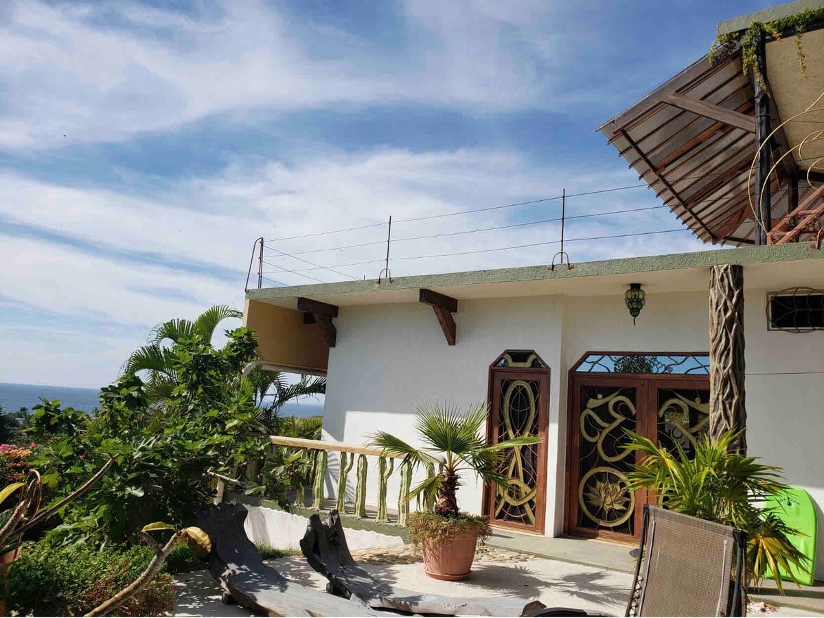 Entire house near Punta Zicatela with panoramic view of the Pacific Ocean, to enjoy a beautiful sunset/sunrise. The first room has a king size bed, handmade copper bathtub only decoration (does not work) bathroom, dressing room, office. The other is equipped with a queen size bed, desk and bathroom. It has a living room, kitchen, the dining room is a terrace with incredible ocean views, a beautiful pool and unparalleled architecture, surrounded by vegetation. Enjoy peace, tranquility and privacy.