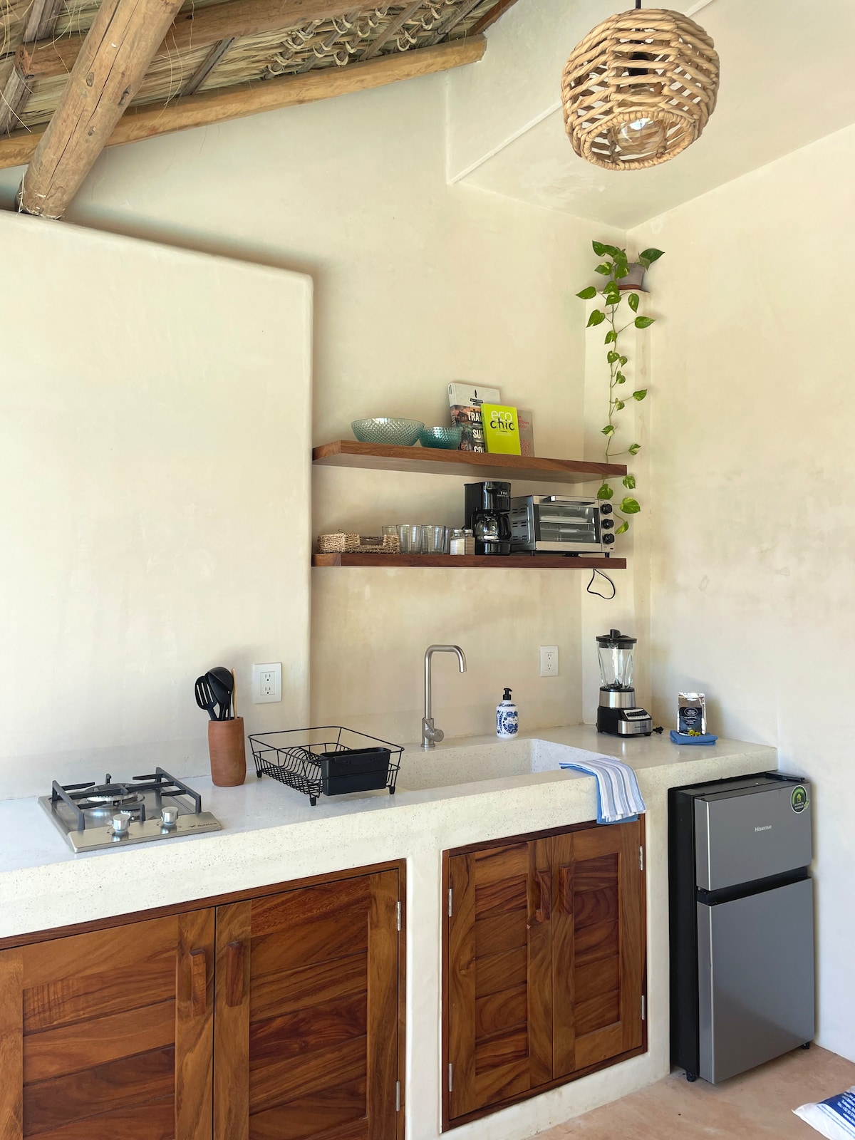 Studio for two, just above Playa Manzanillo, the beach with the calmest waters in Puerto Escondido. Built alongside a pool with a stunning ocean view, the cabaña features a full kitchen, solar hot water shower, ample closet space, built in lock box for your valuables, and a Starlink WiFi connection. No need to rent any wheels - we're just a 10 minute walk to the restaurants & shops of either Rinconada, or El Adoquín. Playas Carrizalillo & Zicatela are just a few minutes further.
