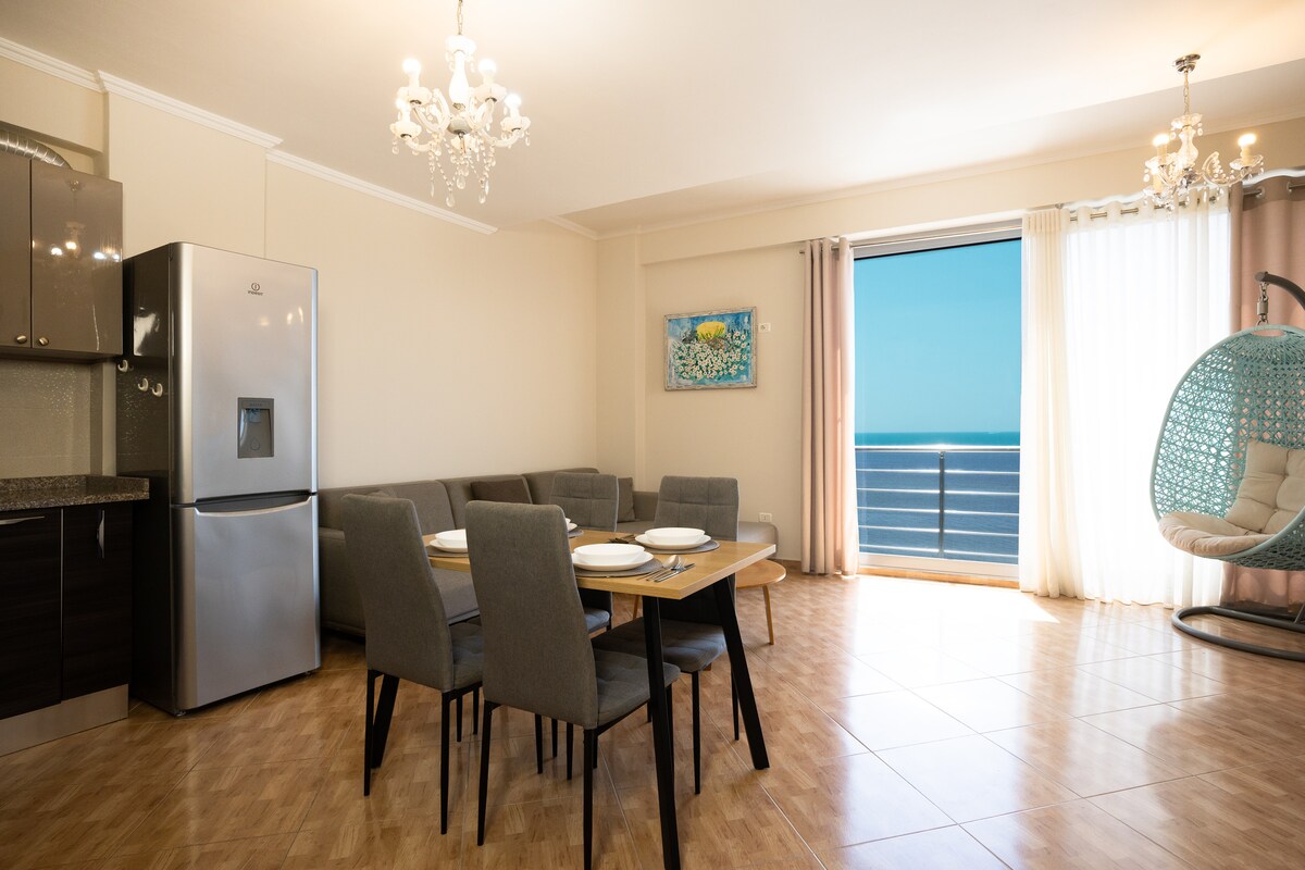 🎙️Presenting the ‘Oceans Eleven Pearl’ ⚜️Greetings from our Sea View apartment. Amenities for a comfortable and lengthy trip. 📍Rruga Venecia/Visited area/Quiet night Free parking garage in the building . 🏖️Beach front/Beach essentials . Living room with balcony/Sea View. 🏠The all space is about 70m2. Fully furnished Kitchen.