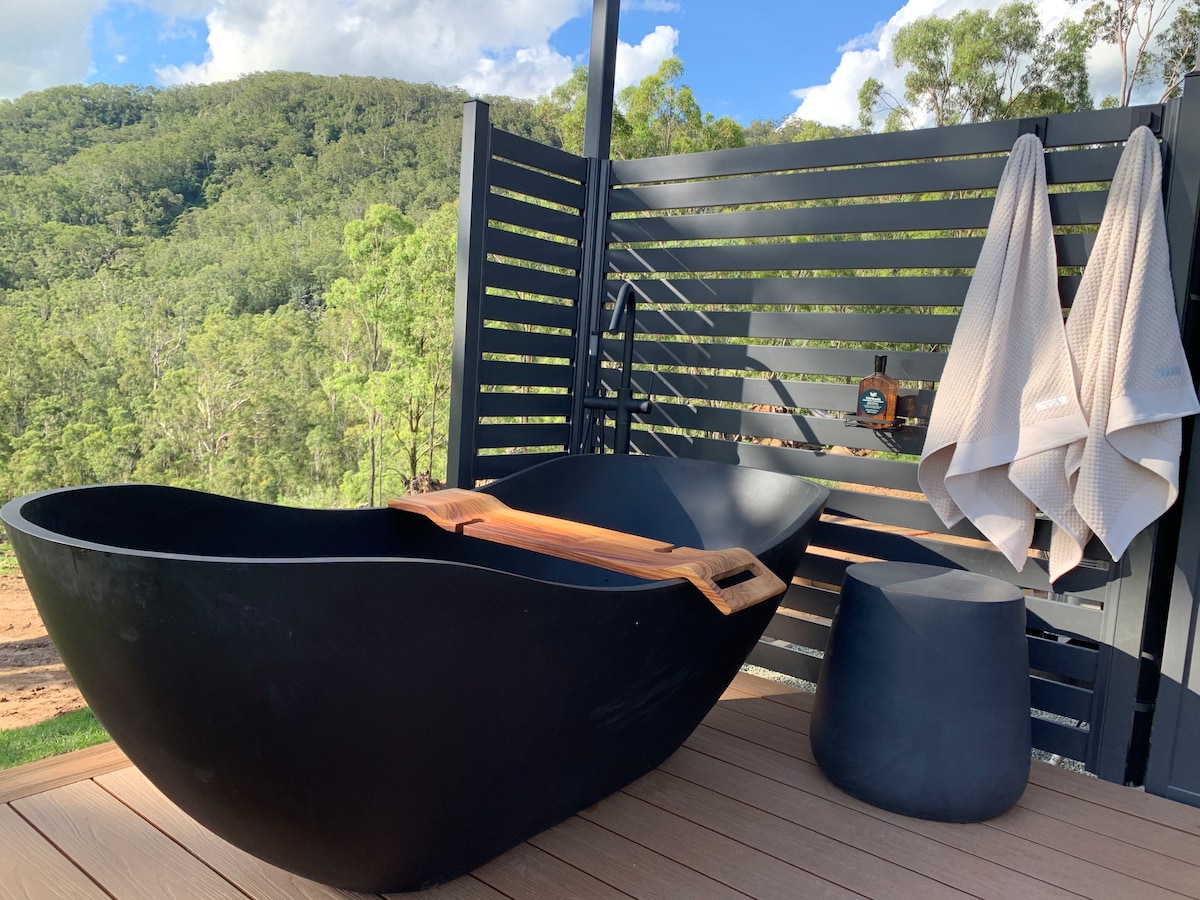 Luxurious eco tiny home in the heart of the Hunter Valley. This architecturally designed eco tiny home has everything you need for a well deserved break; privacy, amazing view of the Hunter River and surrounding bush land, queen Tempur Cloud bed and premium linen, air-conditioning, fully equipped kitchen, bathroom with eco-friendly toilet, living area with workspace, mini library, games, deck, outdoor bath, fairy lights, BBQ and fire pit.
