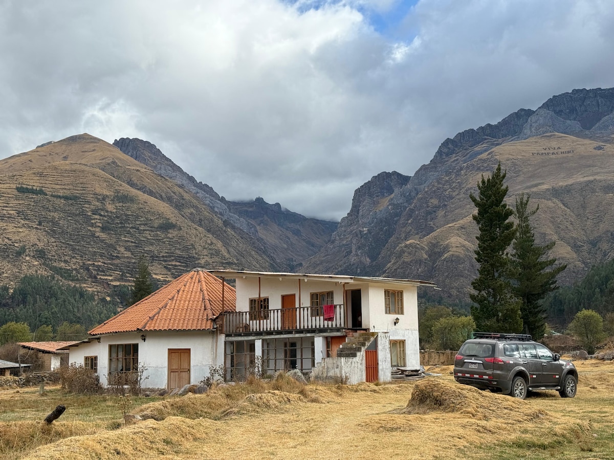 Nos encontramos en una tranquila y hermosa comunidad campesina, Pampachulla. La casa está entre árboles de eucaliptus y pinos, con vistas a los campos de cultivo de mi propiedad. El entorno es extenso y seguro para caminatas. Se puede visitar el cañón de dos colores en la misma Pampachulla, y a 15 minutos en coche las aguas turquesas de Muñapata. Ideal para los amantes de la naturaleza y la tranquilidad. Hay zona para aparcar el carro, y hay servicio de taxi tanto en Urcos como en Pampachulla