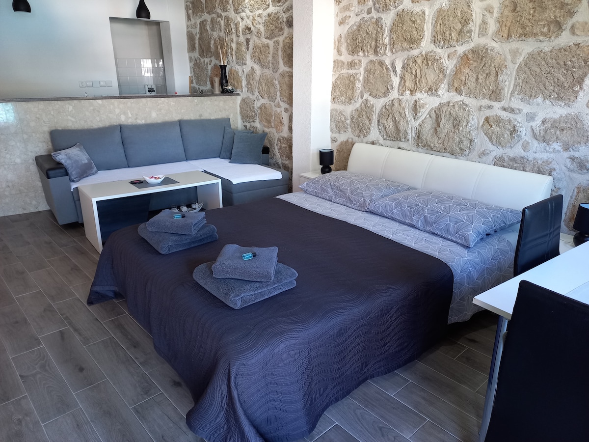 Modern comfort meets historic charm at Studio Nonna. This brand-new, ground-floor retreat features original stone walls and offers rare, stair-free access in the heart of Korčula. Perfectly situated, you are just a 4-5 minute stroll from the ferry port, bus station, and the vibrant Old Town. All within walking distance to the nearest beaches, supermarkets, bakeries, banks, pharmacy, taxi boats, shops, wine and tapas bars, arts venues, historical monuments etc.