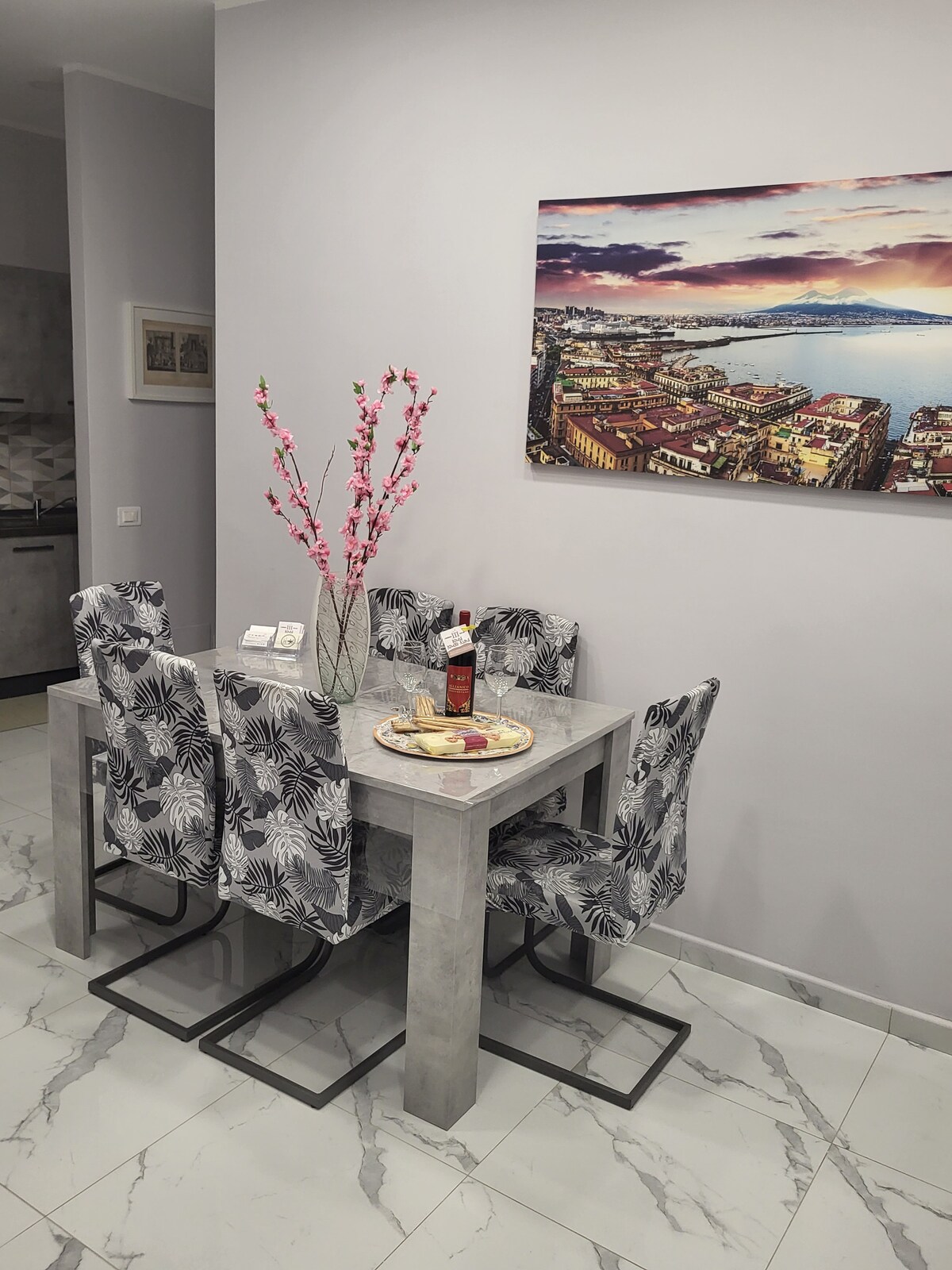 Here days slow down, at the foot of Monte Verde, surrounded by natural light, silence and open views of Mount Vesuvius. The second floor of a historic villa set in the green hills of Angri offers spacious interiors, original period furniture and bright rooms. 150 sqm with three independent bedrooms, two bathrooms, a kitchen and a living area to unwind after exploring. From the balcony, views open over the Gulf of Naples. An ideal base to discover Campania and return each evening in peace.