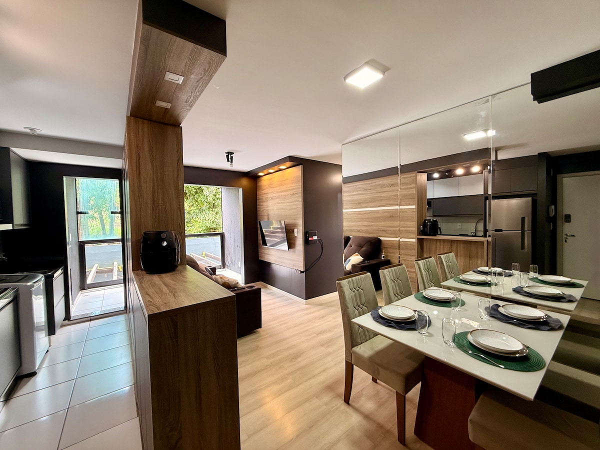 Modern and equipped apartment with stunning views, especially for the sunset. Excellent location, close to pharmacies, gym, UPA, bakery and fruit shop. Parking included. The condominium offers a market and pet space. We prioritize recycling, with specific bins. It has a TV in the living room and bedroom, plus a Nintendo for fun. The home office is well equipped, with an extra screen, mouse pad and gamer chair. Air conditioning in the living room (cold) and fans/heaters in the bedrooms.