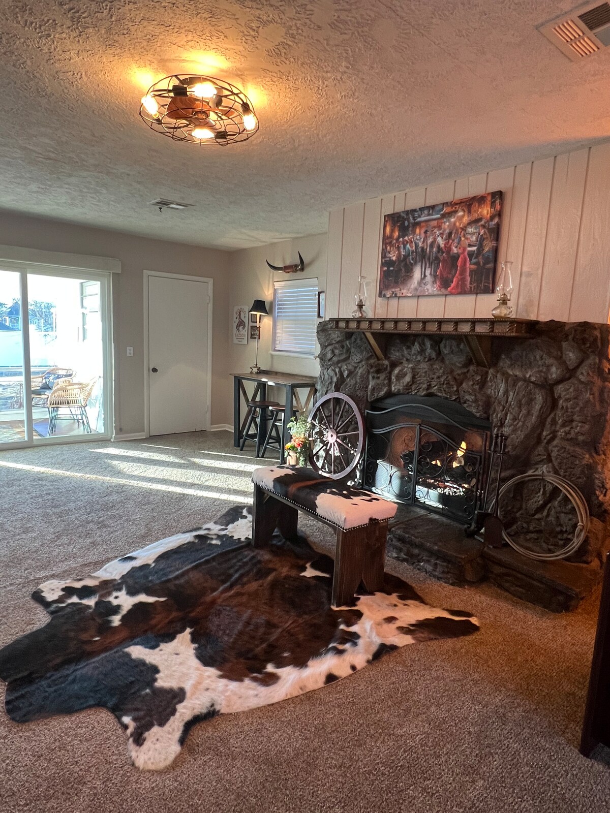 Papa James Bundy (Bun) was not a bandit. Although, he always had a cigarette in hand and gambling was his passion. I hope you feel as welcome as I did when I walked into his home. This hideout is on the edge of town but centrally located between the hospitals. Decorated with a ranch style with interesting pictures of famous bandits. Start your day on the porch and watch the sunrise. End with a whirlpool bath and sit by the fire. Extra attention has been given to end your day in comfort.