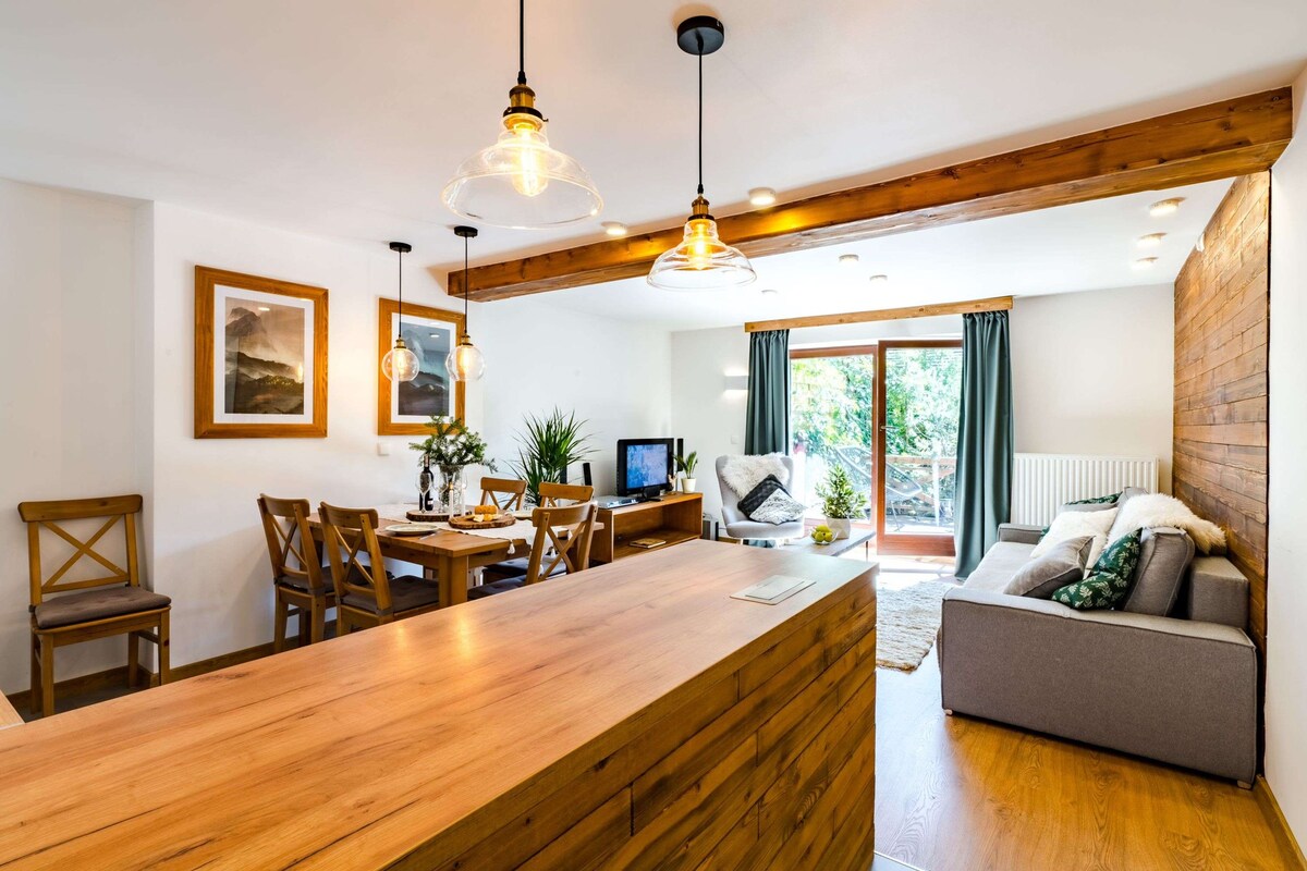 It is one of the oldest houses in Zakopane that we have refurbished recently. The past and now have been matched in a warm and welcoming style. You still can smell an old wood. The porch view extends to a garden and Kasprowy Wierch peak with Giewont peak looming in the background. The garden are ancient trees that allure to walks and further towards the edge of Tatra’s National Park. We offer the following amenities: - Fast broadband wi-fi, tv - Office room - Car parking - Swing, fireplace.