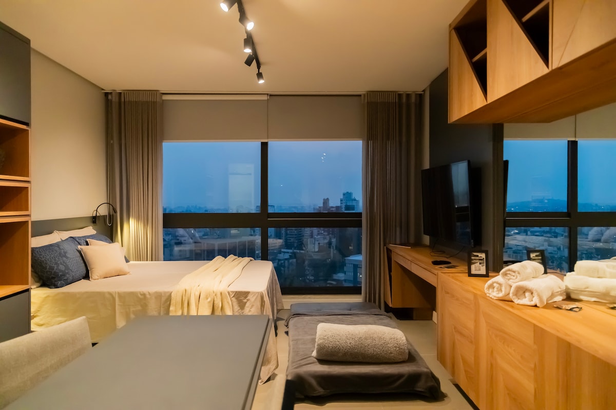 Studio with high-end decor, designed for short or long stays. Ideal for couples or leisure or business travelers. Located in Porto Alegre, it is close to pharmacies, bakeries and markets, as well as offering easy access to the city's main attractions. Located in one of the most valued regions of Porto Alegre, the space has all the infrastructure to ensure a comfortable and pleasant stay. We will be happy to welcome you here!