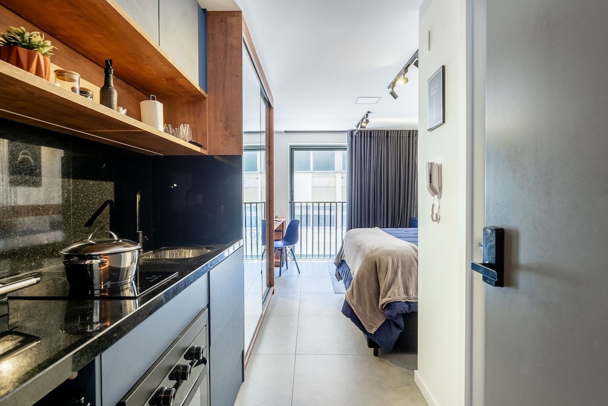 🌇 Here we have: Full Kitchen with pots and pans of great quality, new utensils, induction stove (2 places), dinner area, space for 3rd guest (sofa-bed), SmartTV (Netflix, Amazon, Disney+, YouTube), Fast WiFi, ALEXA, induction charging-pod, Neon sign, clean bed-sheets, ultra comfy QueenBed, hot shower! • Building with Fitness Gym, Rooftop/Terrace, Cowork, Pool Table, Laundry, 24h Front-Desk, Mini Market, Garage (paid) ☺️ Send us a message! :)