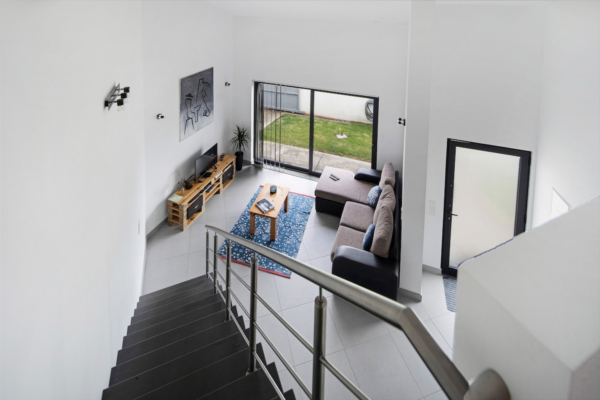 O Apartamento 01 está incluído num complexo de 6 apartamentos, o AngrA+. É um estúdio (T0), térreo e apropriado para mobilidade reduzida. Tem 40m2 e é dominado por um arco em cantaria do séc. XVII. Tem uma ampla (17m2) varanda exclusiva com mesa/cadeiras e com vista sobre o jardim, a cidade e o mar. Ocupação máxima de 2 pessoas. Os espaços comuns incluem um jardim, uma pool exterior, um salão com biblioteca e lareira, uma esplanada e uma lavandaria self-service.