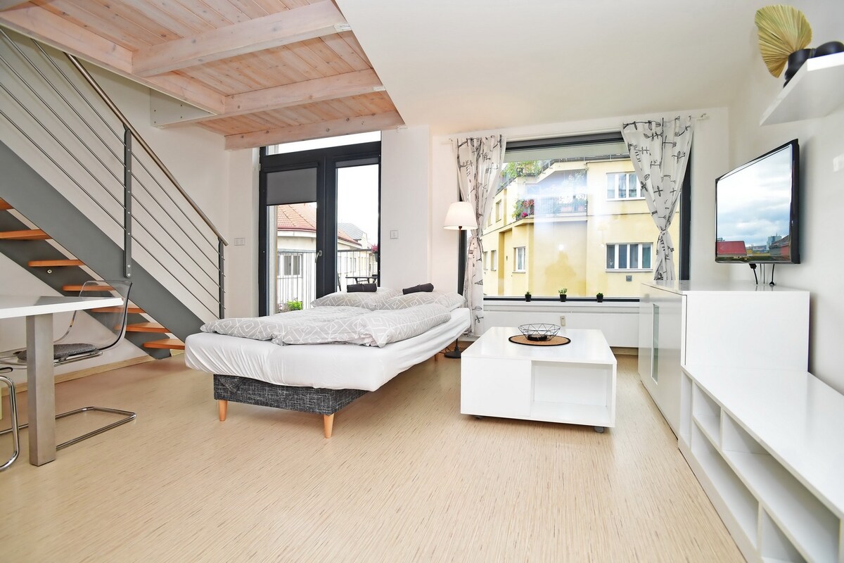 Experience Prague in style from this fully renovated duplex apartment, perched on the top floor of a modern conversion of a historic factory. Stay connected with super-fast Wi-Fi, unwind with a smart TV, or get work done at the dedicated study desk. Step out onto the cosy balcony with stunning views. Conveniently located near public transport, with direct tram and train access to the city centre, this apartment is the perfect blend of comfort, style, and location for your Prague getaway.