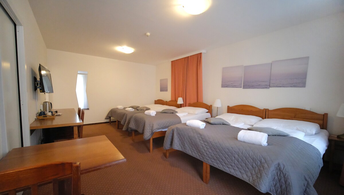 Attic family room with 2 bedrooms, each with a double bed. Bathroom with shower and toilet, hairdryer. All rooms are equipped with LCD TV, mini fridge, fan, safe and coffee and tea set. The room offers accommodation for a maximum of 4 people. Beds can also be separated. Guests can purchase breakfast on site. If you are interested in parking nearby, please contact us in advance to reserve a spot.