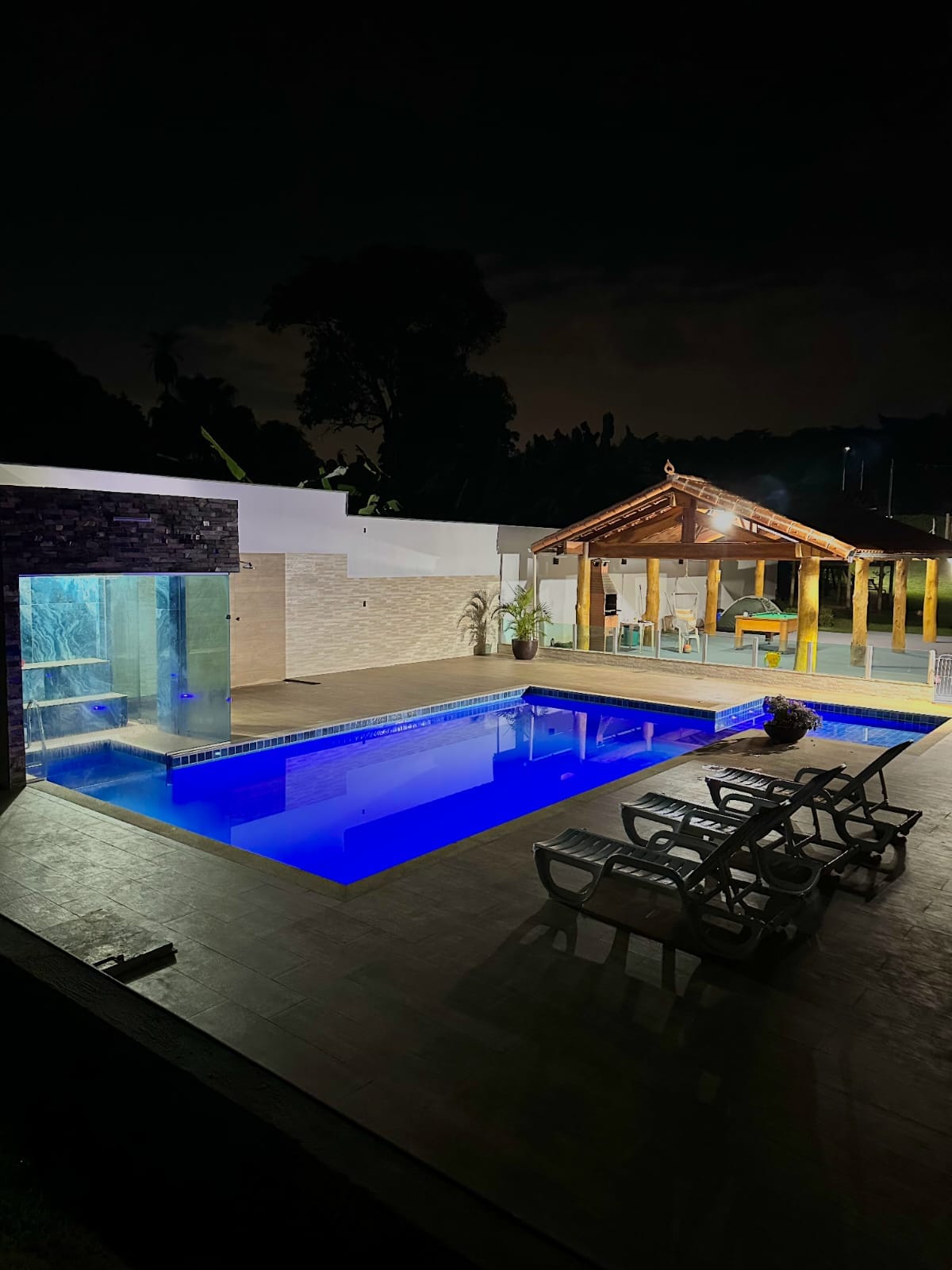 Experience unforgettable moments in this unique place, ideal for families. Come relax and escape the stress of the city! Our property has a swimming pool with an integrated sauna, hydro integrated into the pool, waterfall, pool, barbecue, large lawn space, tree house. The space has two bedrooms, one bedroom with a double bed, a single bed and a 32-inch TV. The other bedroom has two bunk beds. And for your convenience, we offer high-speed Wi-Fi throughout the property.