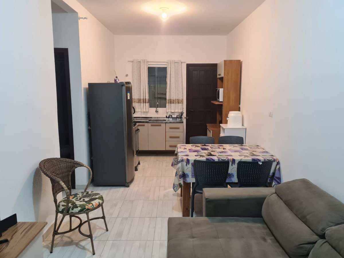 The apartment consists of a large room, 40 inch TV, WI-FI, table games, equipped kitchen, microwave, coffee maker, thermos, barbecue, barbecue, laundry, washing machine, two bedrooms, one with suite, a bathroom in the hall, air conditioning, two double beds, available single mattress, bed and bath linens (Upon request and payment of an extra fee of R$35.00 per person), beach chairs, umbrella, and private parking.