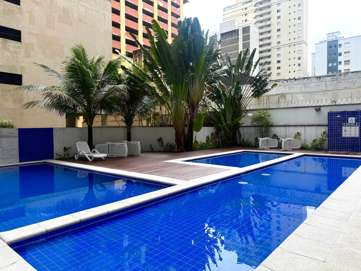Welcome to our little corner in Guarujá! Our apartment was designed for families, including pets, and accommodates up to 4 people! Super well located, just a 10-minute walk to Enseada Beach, our apartment is surrounded by markets, restaurants, pharmacies and Pets The beach is just a 10-minute walk away, and the apartment also has the entire structure for a Home Office, with high-speed internet, a monitor, and a wireless keyboard and mouse kit. Come and see for yourself and you'll be charmed!
