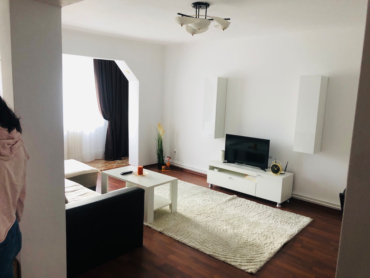 Sudio modern cu 2 camere, situat într-o zonă liniștită. Ideal pentru familie sau un cuplu, acest apartament oferă confort fiind izolat termic si fonic. - Living spațios cu canapea extensibilă, TV cu ecran plat - Dormitor cu pat matrimonial, dulap generos - Bucătărie deschisă, echipată cu aragaz, cuptor, frigider, mașină de spălat rufe - Baie modernă cu cabină de duș cu hidromasaj si radio - Proximitate față de supermarket-uri, restaurante,cafenele, parcuri,spital - Locuri de parcare cu plata