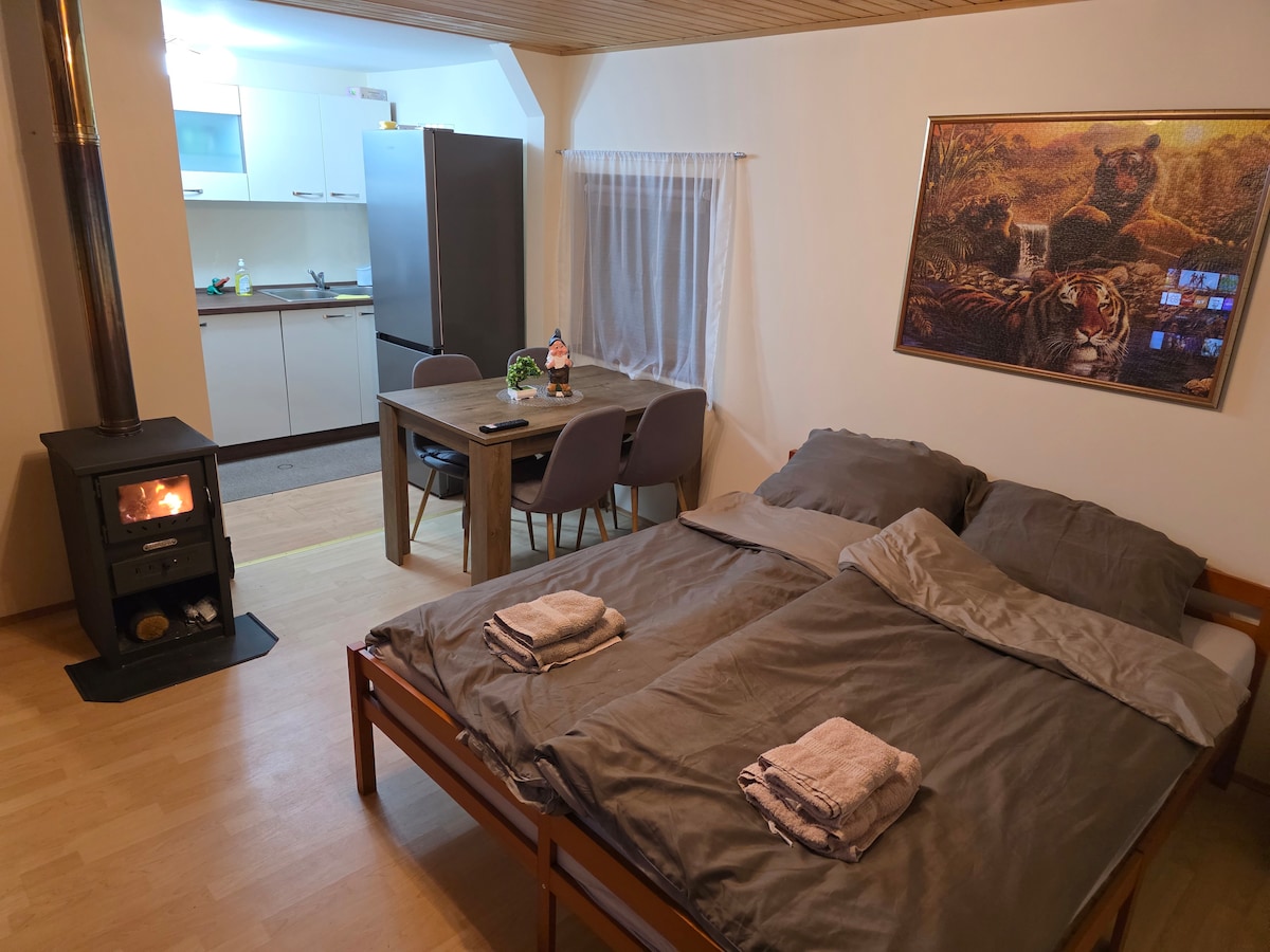 Enjoy at spacious outdoor place in rustic green environment, within walking distance of a large thermal complex and a golf course. This open-space appartment is entirely on the same level (including the shower in the bathroom); the passages between the individual parts are easy to pass also for disabled people. It shares a large yard and the garden with another apartment. Available are a grill and bicycles for wandering along the picturesque cycling trails in the area. Pets are wellcome.