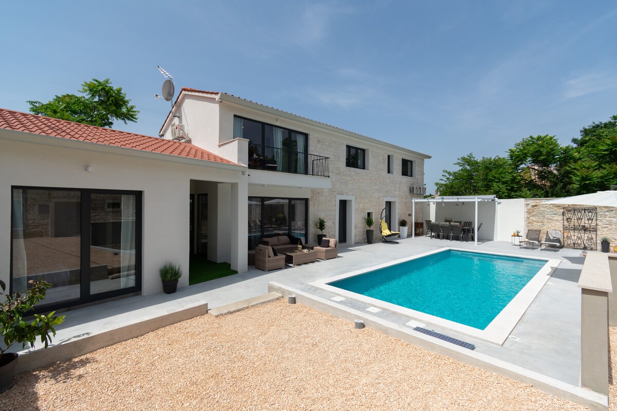 Daleko od buke prometnica, obnovljena u tradicionalnom istarskom stilu, dva spojena objekta, zasebni ulazi, za ukupno 12 osoba. Na raspolaganju je bazen, 12 ležaljki. Prigodno za djecu: ljuljačka, trampolin, stolni tenis. Obje kuće u prizemlju imaju kuhinju, blagovaonicu i dnevni boravak, a na katovima veće kuće su 4 sobe; manje kuće 2 sobe, svaka sa en-suite kupaonicama. Sve prostorije su klimatizirane. Na vanjskoj terasi je stol sa stolicama i roštiljom. Idealna za ljubitelje mira, tišine.
