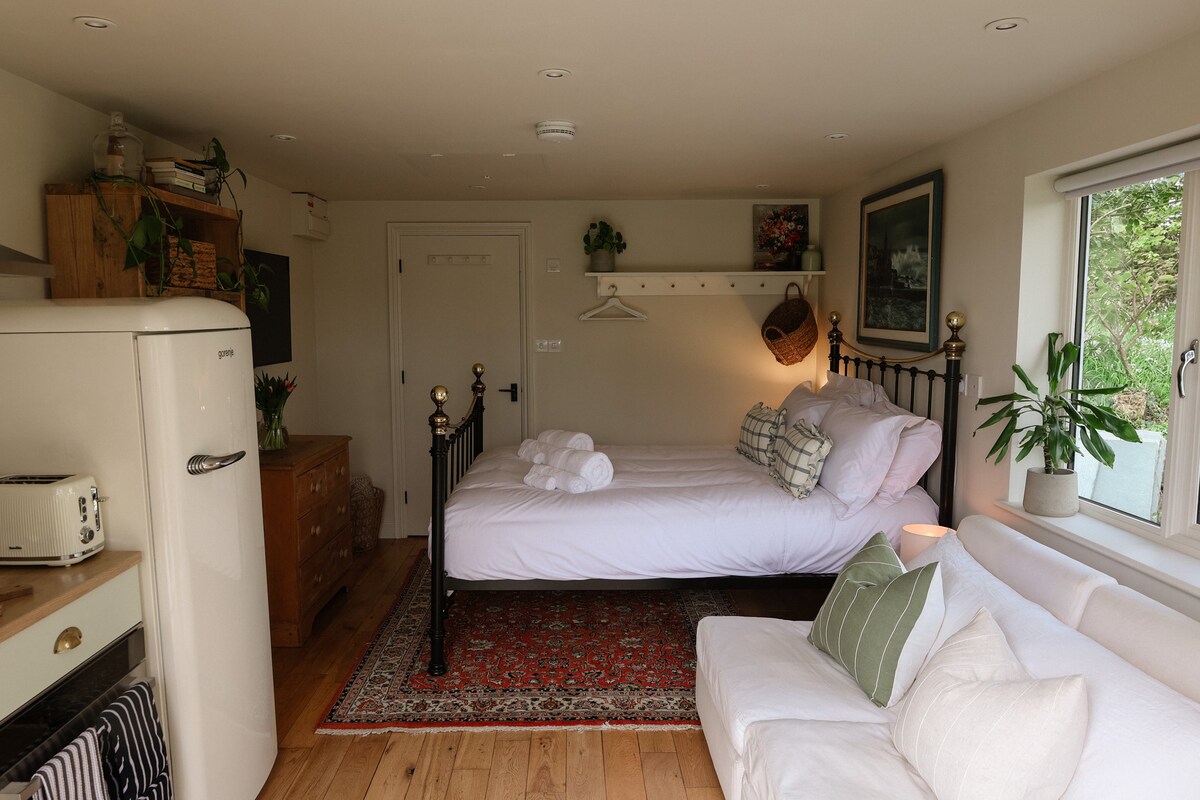A lovely tranquil detached wood lined studio cottage in the grounds of Trenoweth House, Gardeners Cottage offers spacious open plan living for two people with a sofa bed to sleep another adult or two small children. The cottage is set in the walled kitchen garden, as well as having shared access to grounds of the main house, the swimming lake and woodland that forms the Trenoweth Estate. it is a mix of fabulously simple and rustic with all mod cons. Under floor heating and washing machine.