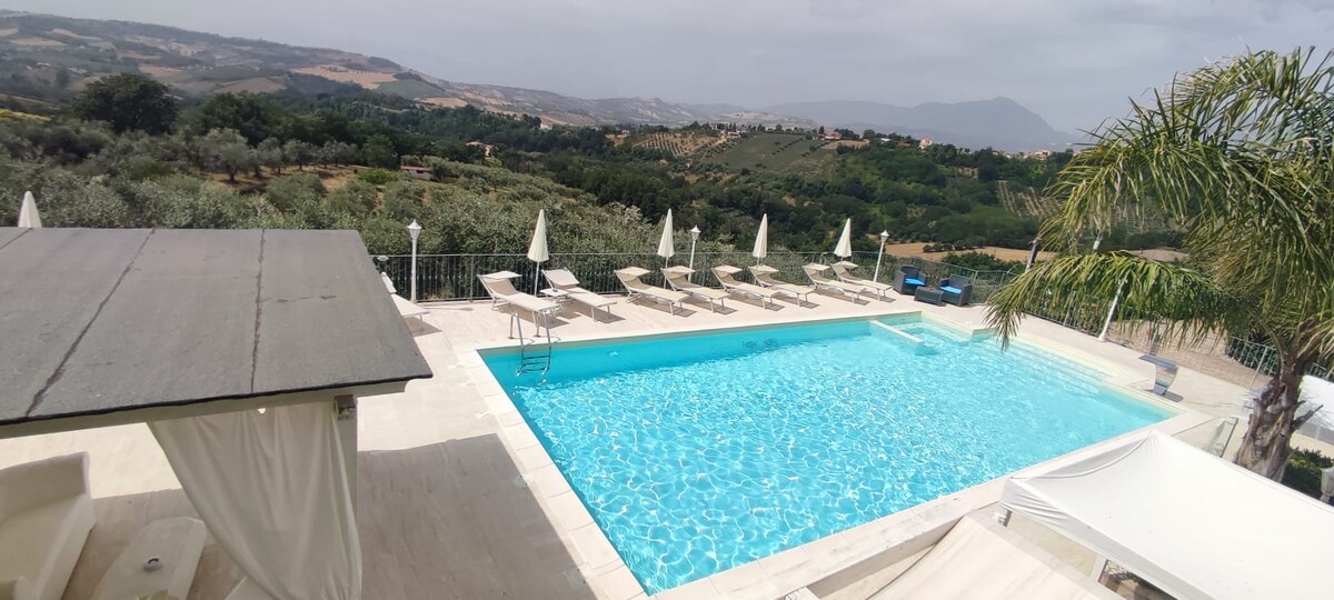 A delightful, new and big studio flat for a couple with 2 children located on the ground floor in the shape of L .in a renovated villa 10 minutes from the sea. This studio is located right near the pool and near a nice wooden porch where you can have lunch; a fantastic view overlooking the pool-Gran Sasso will brighten your stay! if you are in 6 we will also give you a room with a connecting bathroom, so you will have a much bigger apartment! the beaches just 11 km away!