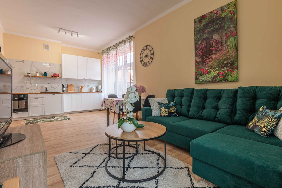 Komfortowy apartament w centrum miasta. Do dyspozycji całe mieszkanie 48 m - sypialnia z podwójnym łóżkiem (szerokość 140 cm) oraz salon z aneksem kuchennym. W salonie rozkładana sofa . W pobliżu główne zabytki miasta. ( 400m ratusz miejski, 950 m - rynek starego miasta, zamek). Dostępne 1 bezpłatne miejsce na prywatnym zamykanym parkingu, tuz obok budynku. Ponadto w pobliżu również miejski parking (od godz.17 oraz w weekendy bezpłatny).