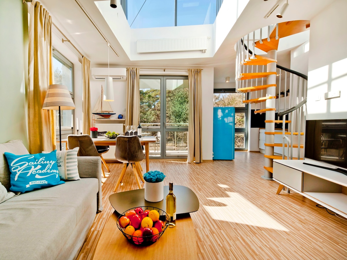 Gdynia Deluxe Apartment is the perfect place to spend a few days in Gdynia and the Tri-City. The apartment is 30 sq m and is located in the attic of a four-storey tenement house on a quiet street in the center of Gdynia. You can walk to the main street of the city, where the whole life of Gdynia takes place. In the immediate vicinity there is the Riviera Shopping Center, restaurants, bars, cinemas, bowling alley, theater and numerous shops. A walk to the sea will take 10 minutes and the same to the Tricity Landscape Park.