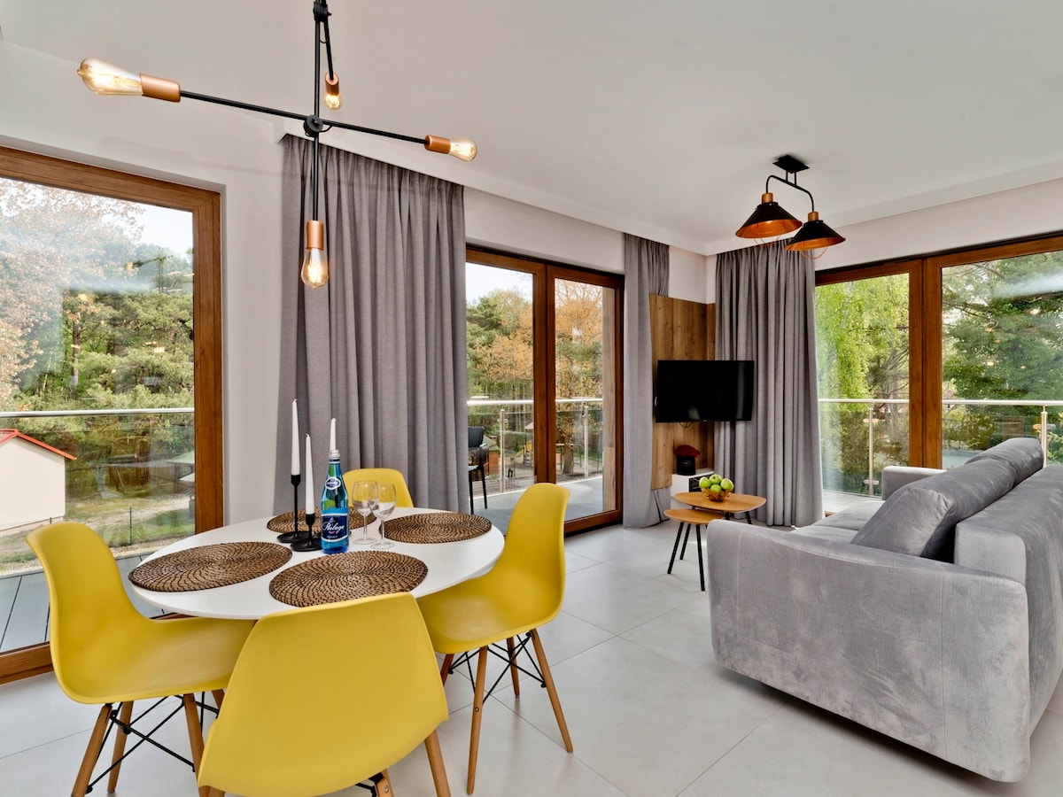 Welcome to a stylish apartment located in the heart of the pearl of the Polish coast. Our guests will find all modern amenities such as a dishwasher, 50" smart TV, soundbar, freezer, etc. The apartment is located in the center of Jurata near the beach and promenade. The air-conditioned interiors will allow you to catch your breath, and the covered terrace, surrounded by greenery, will provide moments of relaxation. For small children, it is possible to add a cot. You are welcome :)