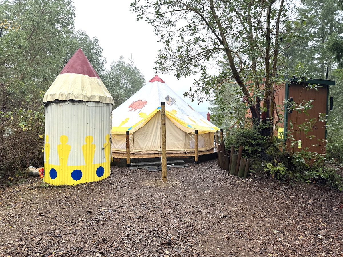 An off-grid canvas bell tent, set in the horse pasture on our multi-generational 23 acre family farm. Secluded, rustic, quiet, and peaceful, this glamping site is set up for you to come and relax. The tent has a queen size bed, interior stove, an outdoor fire pit and cooking grill, and walk through the forest to a faerie glen! No electricity or running water currently are available, but potable water and battery bank provided. 25 minutes from the airport, 30 minutes to Seattle and Puget Sound!