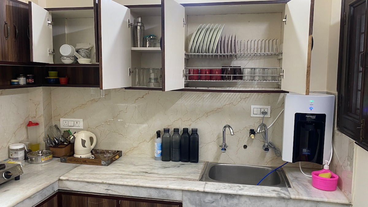 * Get a Resort feeling in the heart of city with noisefree peaceful and safe surroundings with private entrance * One master AC bedroom with green lawn view from inside,Led Tv,spacious and hygienic washroom,marbelled kitchen with refrigerator,utensils,RO and induction cooking * Beautiful big lawn with night lighting,Candle light dinner setup in lawn with soft music * Distance from GOLDEN TEMPLE is 1.8 km (only 3-4 minutes drive ) * All famous tourist spots in 5-7 mins proximity * free parking