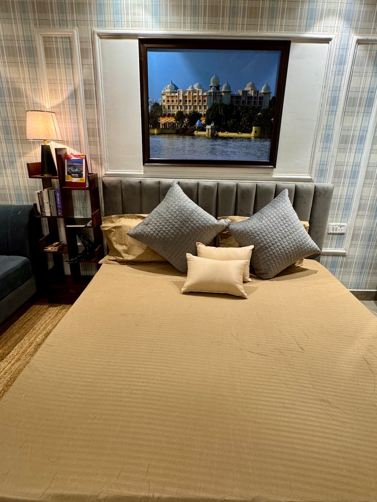 As you enter the flat, it feels like stepping into a new world. Inspired by the stunning architecture of Santorini, the entire space reflects the charm of Greek-style design. Though itâs a 1BHK and 2 extra mattress, itâs spacious, open, and perfect for families or hosting gatherings. With a massive 200-inch projector and an open layout without dividing walls, the flat feels expansiveâlike an entire home in itself.â